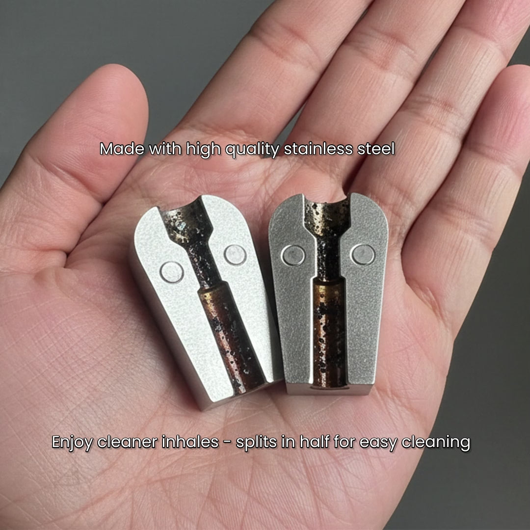 • The Steel Piece — precision-engineered for the cleanest burn & splits in half so its easy to clean.